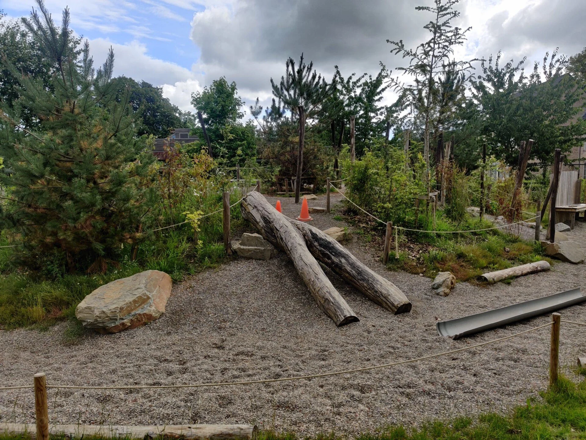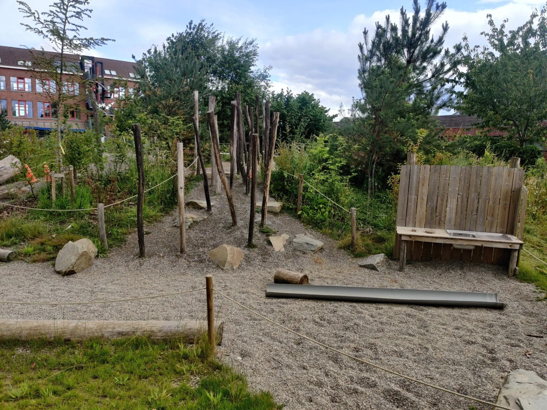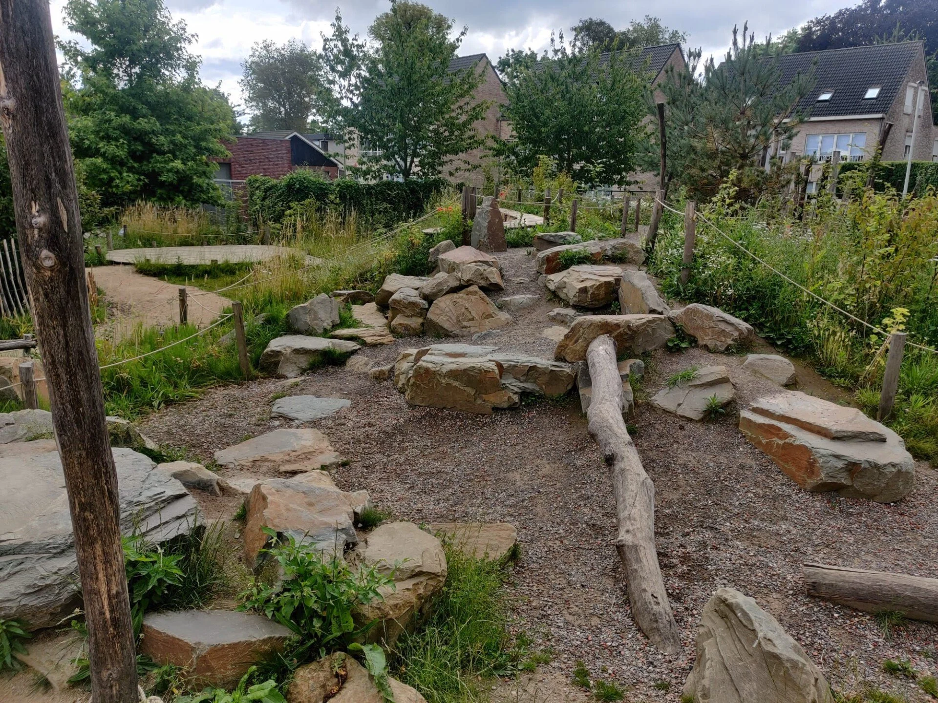 Met ondersteuning van Regionaal Landschap De Voorkempen en in samenwerking met Groen-Atelier werd een groot deel van de verharde speelplaats onthard en omgevormd tot een avontuurlijke speelomgeving. Tegen de bestaande zitarena kwam een speelse bouwzone, verbonden via slingerende paden naar een nieuw BMX-parcours. Tussenin zorgen bomen, struiken en groen voor een natuurlijke, levendige sfeer waarin kinderen volop kunnen bouwen, bewegen en ontdekken.