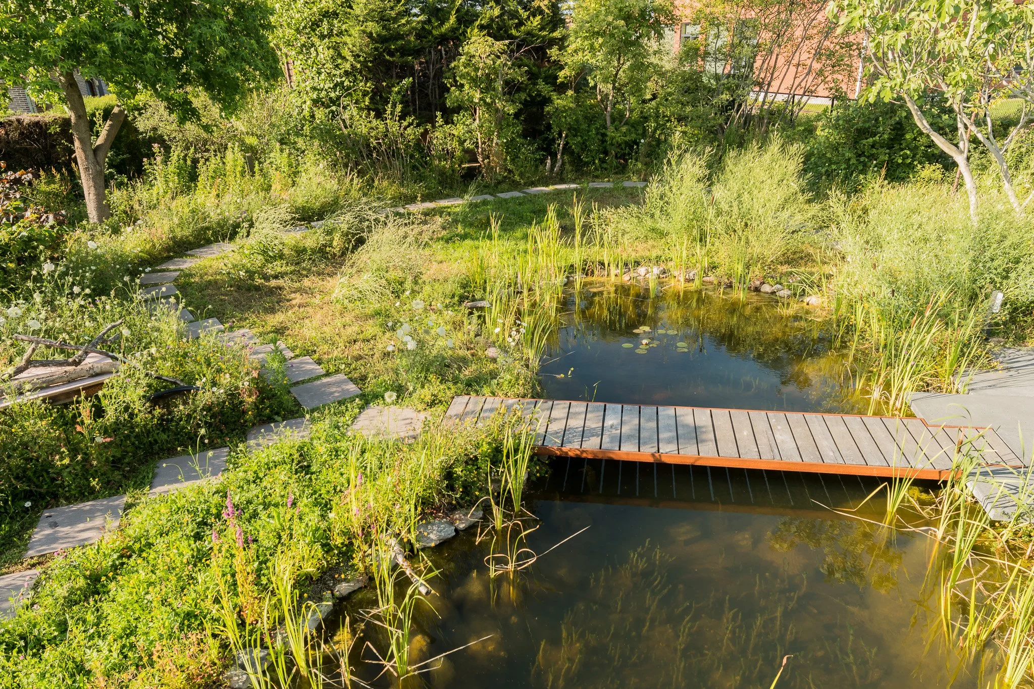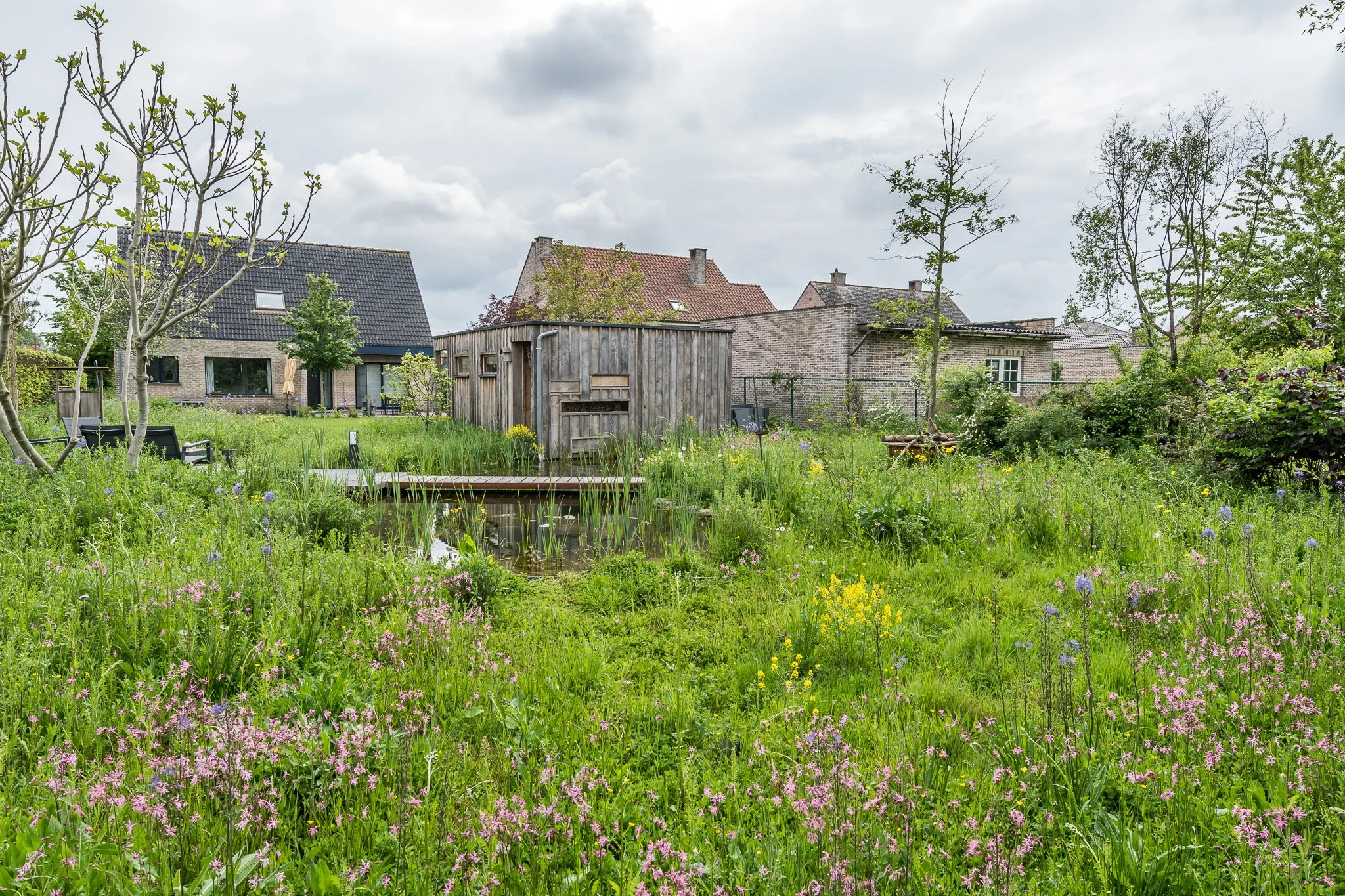 Inge houdt van natuur en fotografie. Met haar nieuwe watertuin kan ze vlak bij huis haar hobby uitoefenen. Vanuit haar tuinhuis, met kijkgaten als in een vogelkijkhut, gluurt ze naar de vijver. Die wordt gevoed met regenwater van het dak, en loopt dan weer over in een wadi.